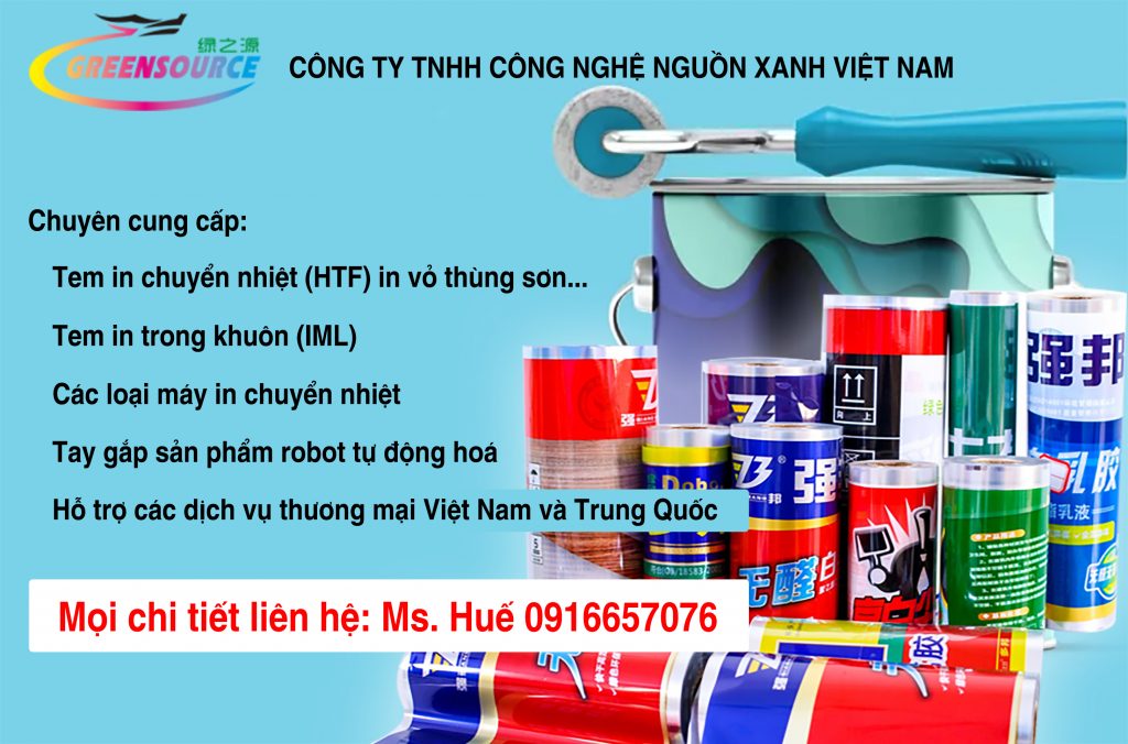 Chúng tôi chuyên cung cấp Tem in trong khuôn (IML) Robot in trong khuôn (IML). Máy in chuyển nhiệt, Màng in chuyển nhiệt (HTF) trên các loại chất liệu nhựa, thùng sơn, thùng dầu. Phụ kiện in và hỗ trợ các dịch vụ thương mại Việt Nam – Trung Quốc.